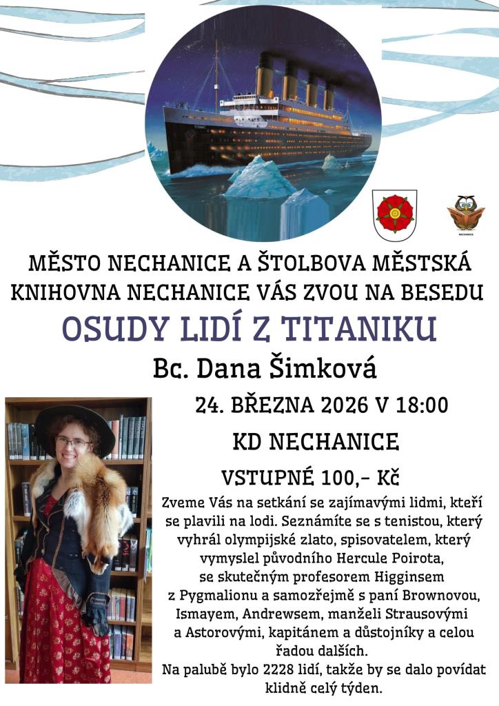 Město Nechanice ve spolupráci se Štolbovou městskou knihovnou Nechanice Vás zvou v úterý 24. března od 18:00 na besedu OSUDY LIDÍ Z TITANIKU, kterou přednese Bc. Dana Šimková. Vstupné 100,- Kč.