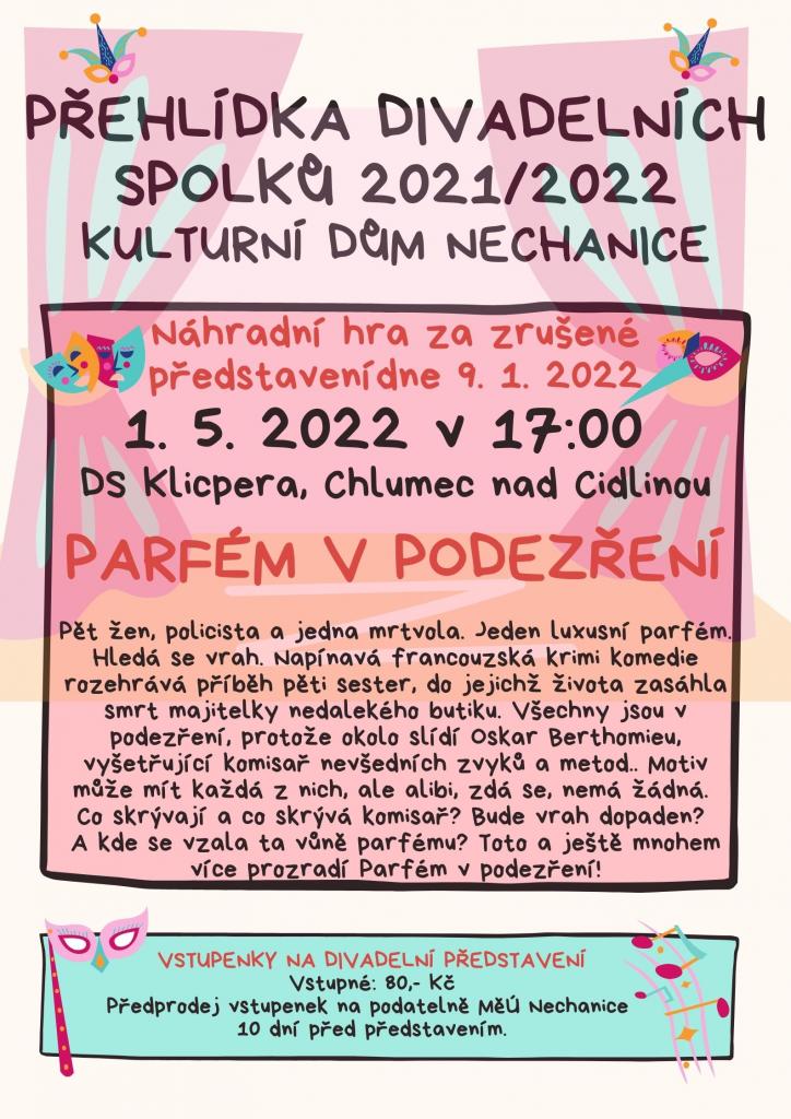 V neděli 1. 5. 2022 v 17:00 hod. odehraje DS Klicpera z Chlumce nad Cidlinou hru PARFÉM V PODEZŘENÍ Těšíme se na Vás!